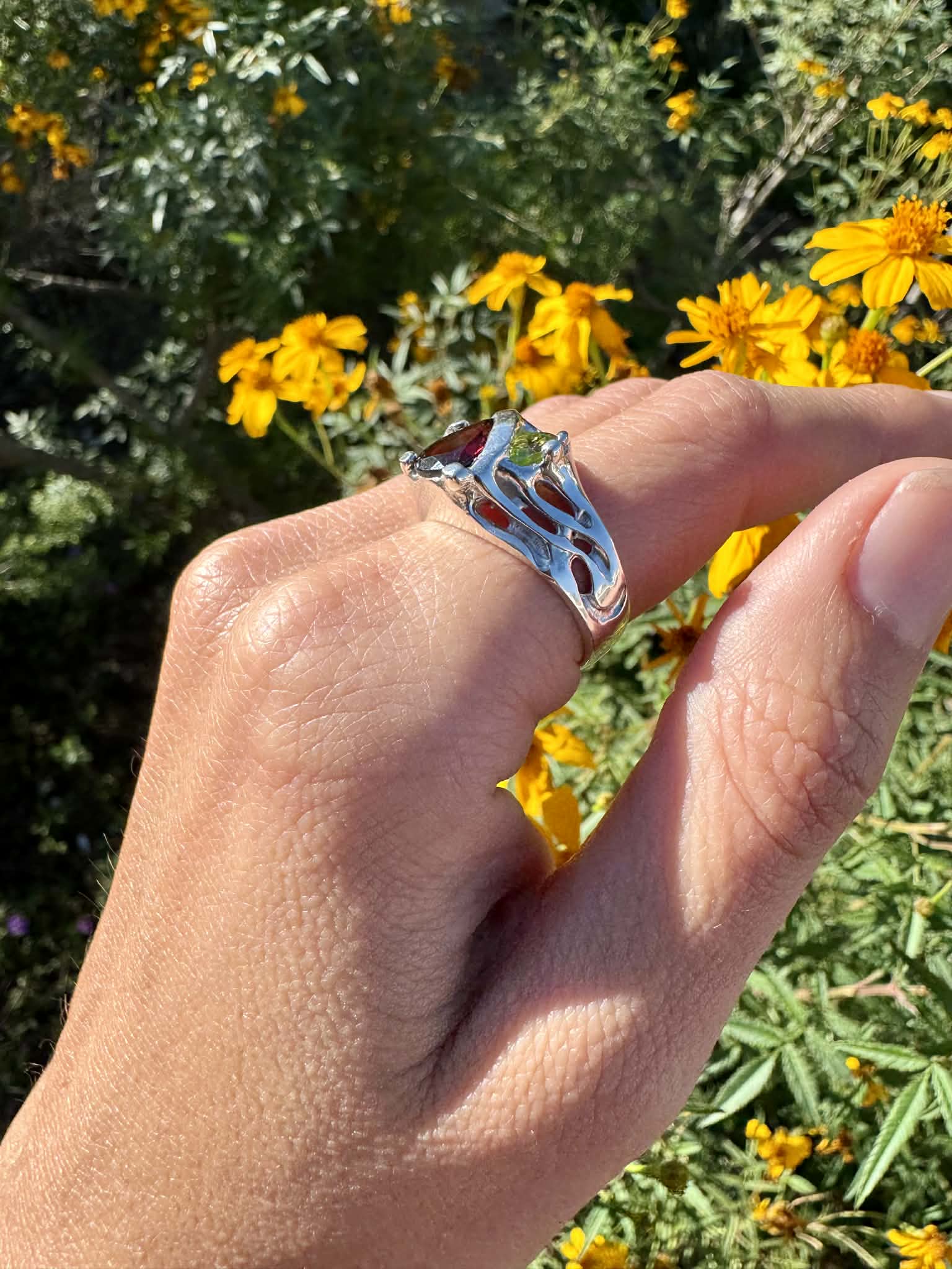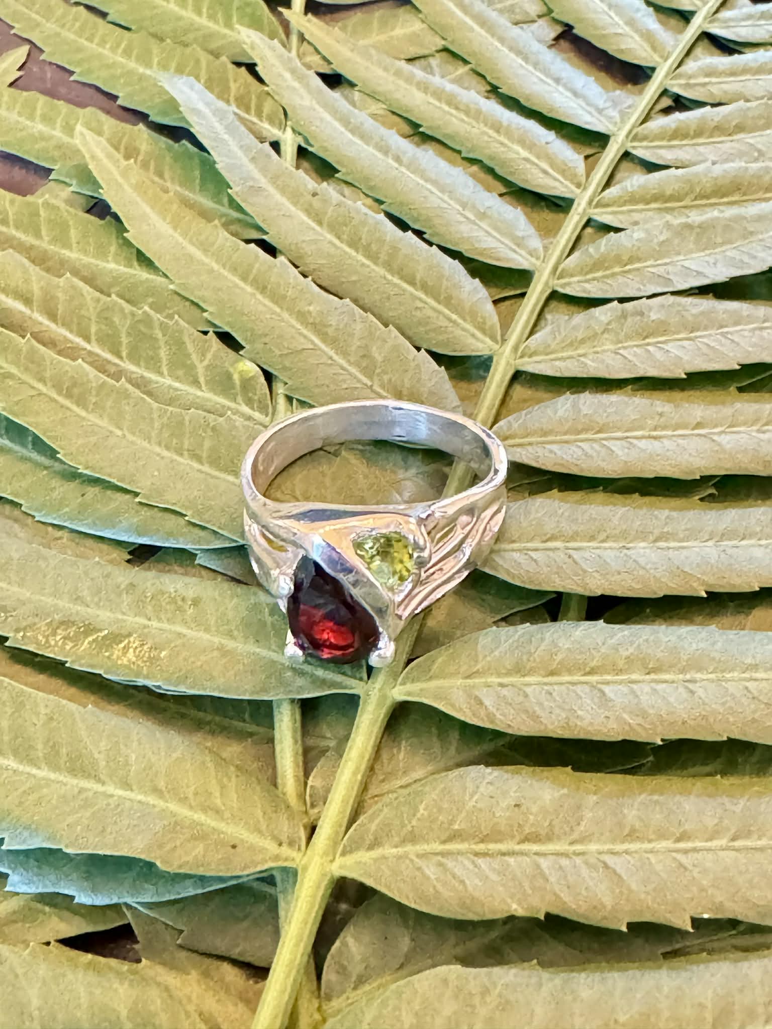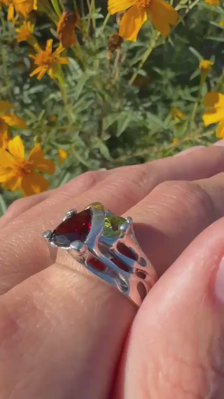Silver Garnet and Peridot Ring Size 9.5