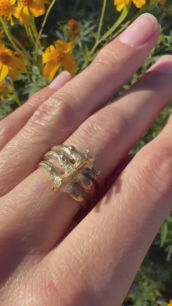 Inspired by anatomical precision, this gold-plated vertebrae ring captures the elegant geometry of the spine in wearable form. Crafted with attention to detail, the segmented design creates visual interest while maintaining a refined aesthetic. The gold plating provides a warm, lustrous finish that complements any skin tone. Perfect for those who appreciate biomimetic jewelry or seek a conversation-starting piece with subtle sophistication. An ideal accessory for medical professionals, anatomy enthusiasts, or anyone drawn to nature-inspired design. Size 7