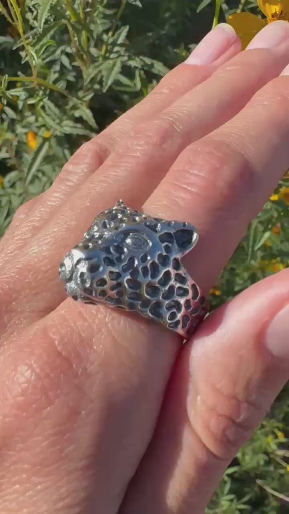 This striking silver jaguar ring captures the fierce elegance of one of nature's most powerful predators. Crafted with meticulous attention to detail, the sculptural jaguar head features expertly rendered facial contours and a commanding presence that commands attention. The ring showcases premium silver construction, offering both durability and a lustrous finish that develops character over time. Sized at 9.5, it's designed for a confident statement piece that works equally well as a bold everyday accessory or a conversation-starting addition to any collection. Perfect for those who appreciate wildlife-inspired jewelry with artistic sophistication.